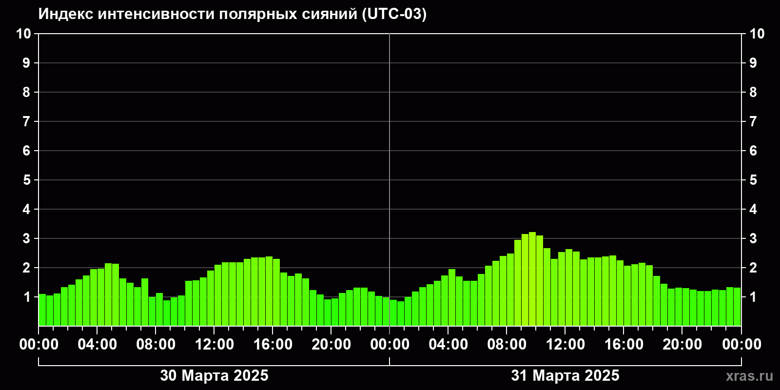 Изменения индекса интенсивности полярных сияний с 2025-03-30 по 2025-03-31 по местному времени