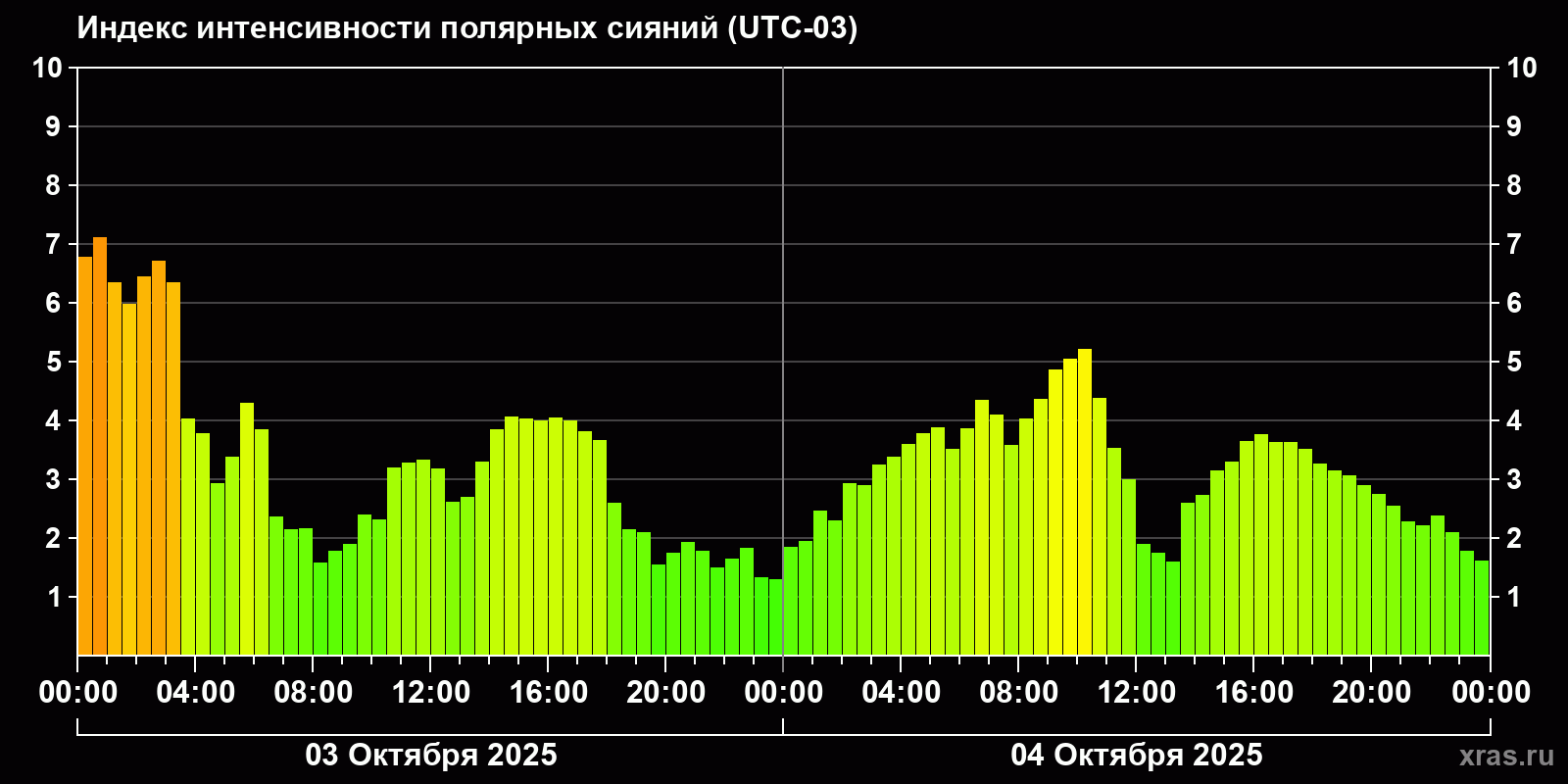 Изменения индекса интенсивности полярных сияний с 2025-10-03 по 2025-10-04 по местному времени