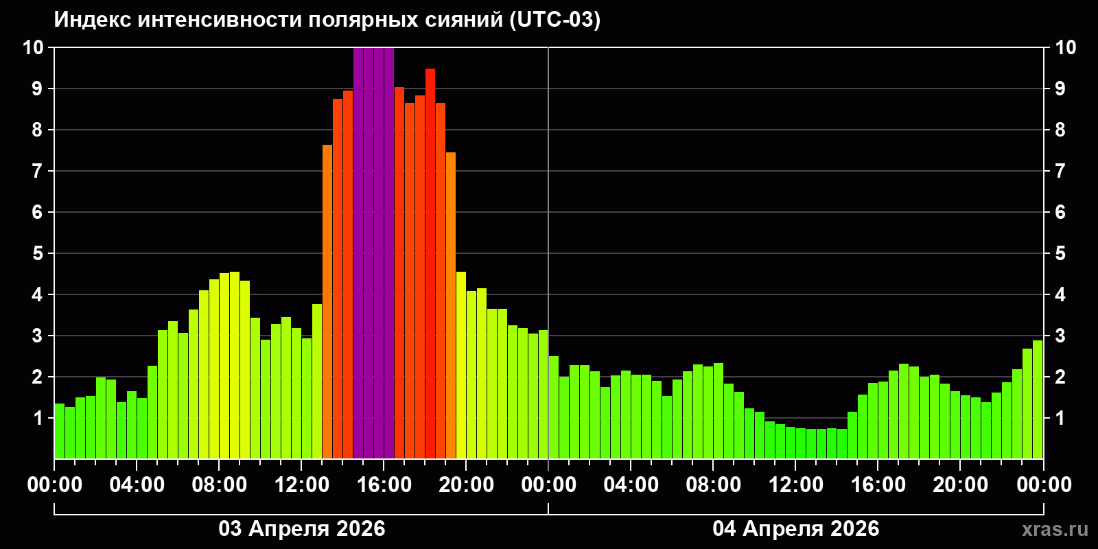 Изменения индекса интенсивности полярных сияний с 2026-04-03 по 2026-04-04 по местному времени