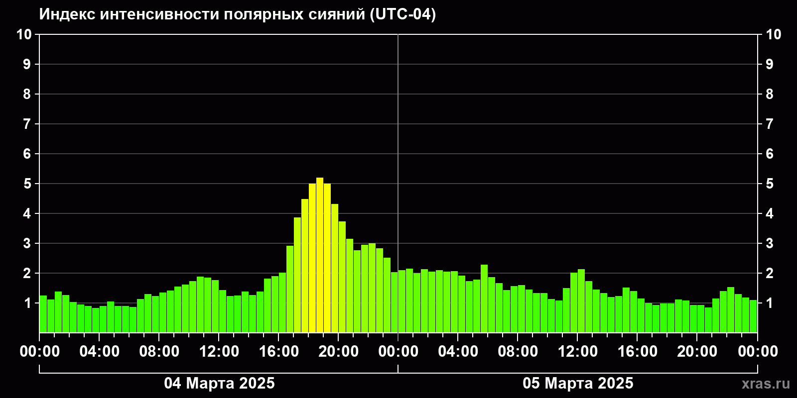 Изменения индекса интенсивности полярных сияний с 2025-03-04 по 2025-03-05 по местному времени