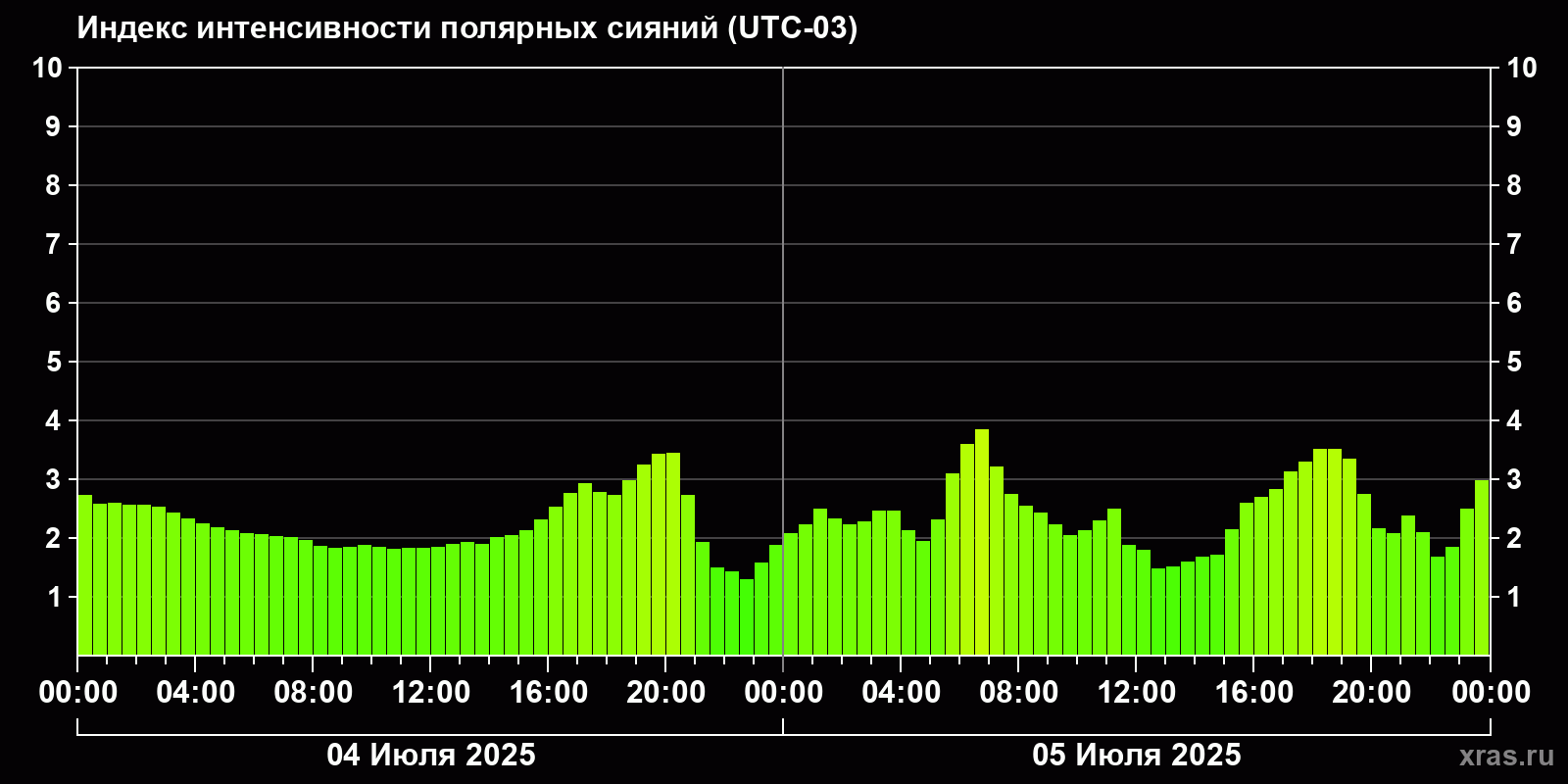 Изменения индекса интенсивности полярных сияний с 2025-07-04 по 2025-07-05 по местному времени