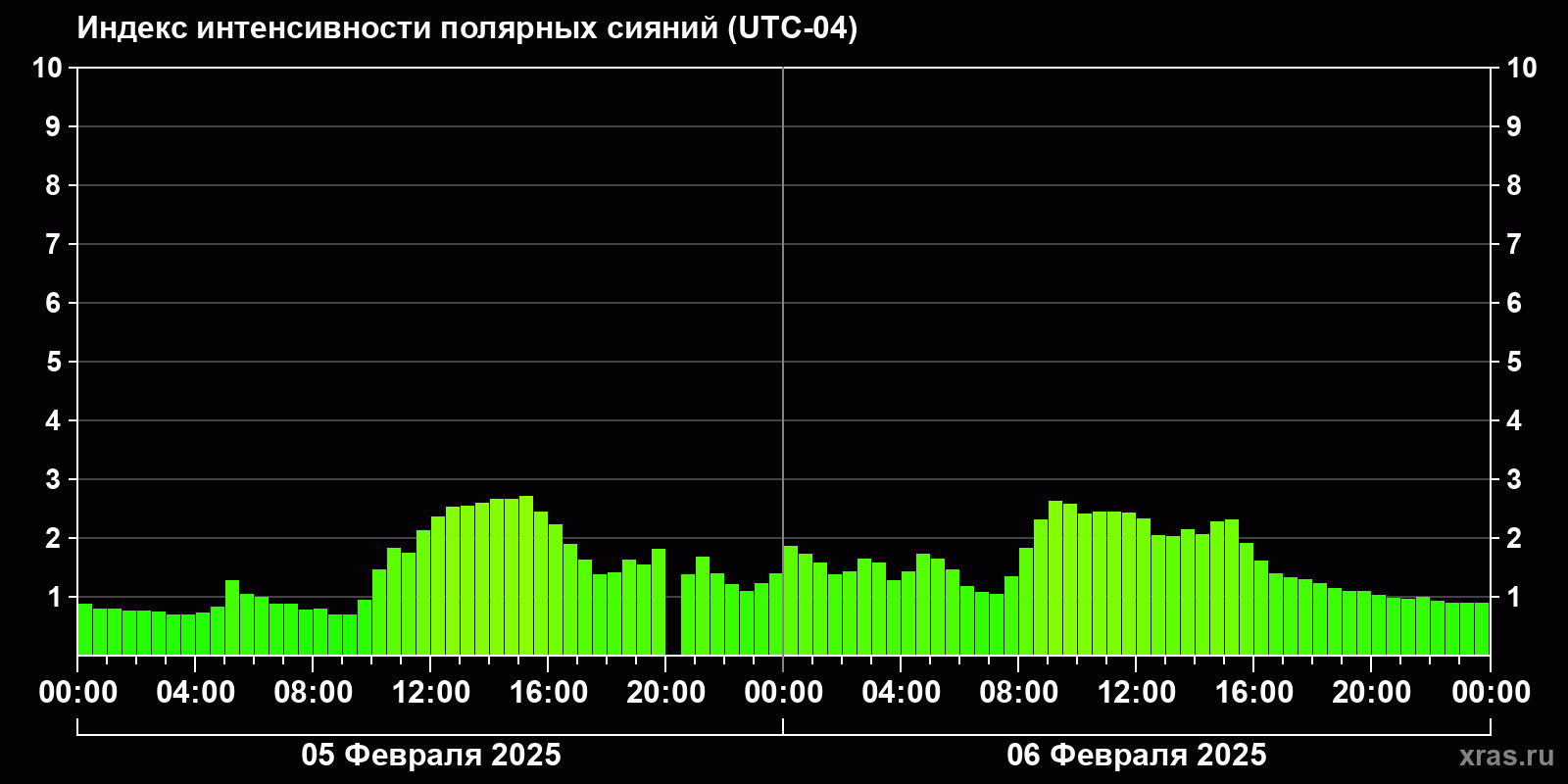 Изменения индекса интенсивности полярных сияний с 2025-02-05 по 2025-02-06 по местному времени