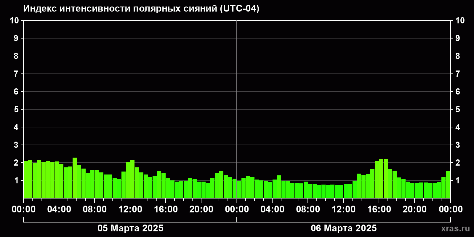 Изменения индекса интенсивности полярных сияний с 2025-03-05 по 2025-03-06 по местному времени