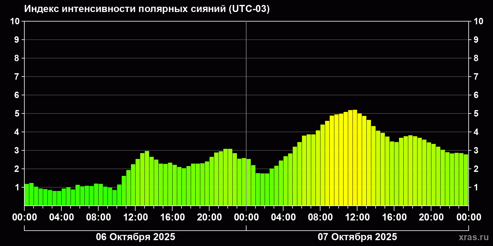 Изменения индекса интенсивности полярных сияний с 2025-10-06 по 2025-10-07 по местному времени