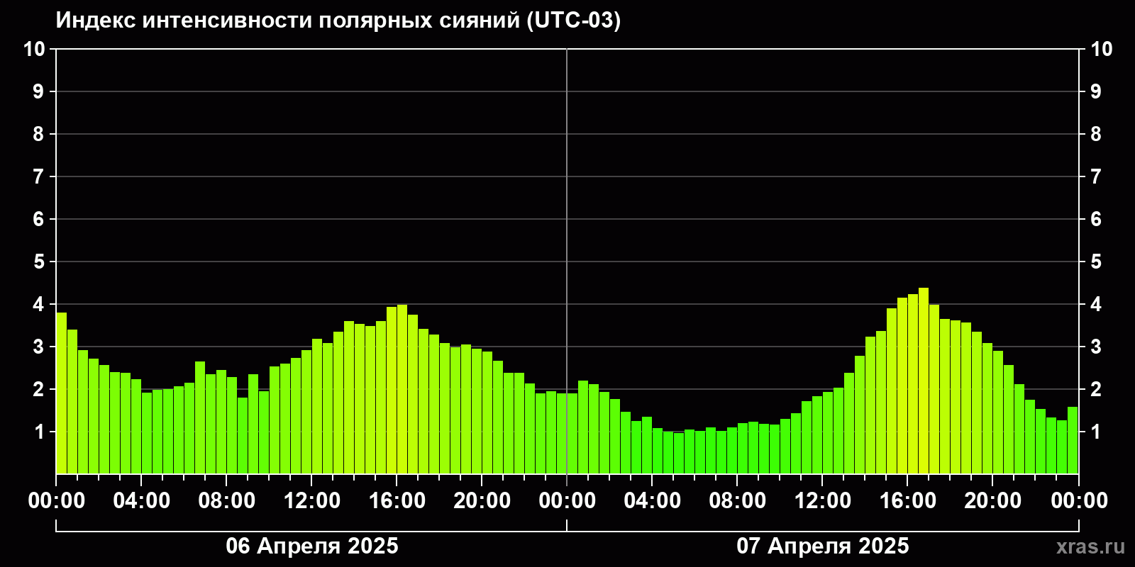 Изменения индекса интенсивности полярных сияний с 2025-04-06 по 2025-04-07 по местному времени