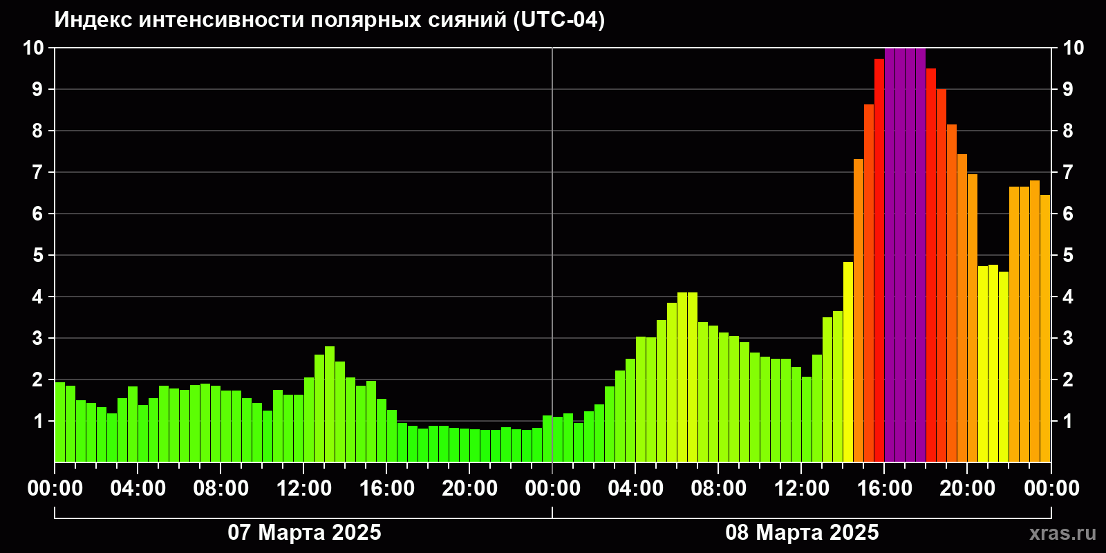 Изменения индекса интенсивности полярных сияний с 2025-03-07 по 2025-03-08 по местному времени