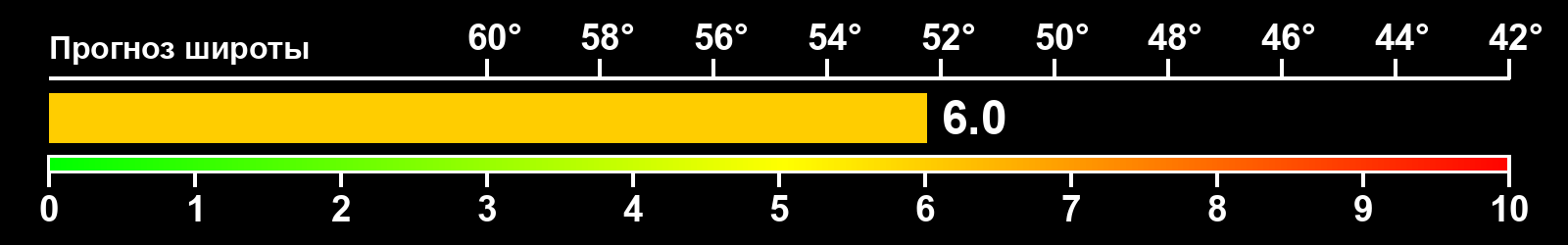 Индекс интенсивности полярных сияний и теоретически возможная широта наблюдений для ночного времени в западном полушарии по состоянию на 2025-03-08 23:55 (конец дня) по местному времени