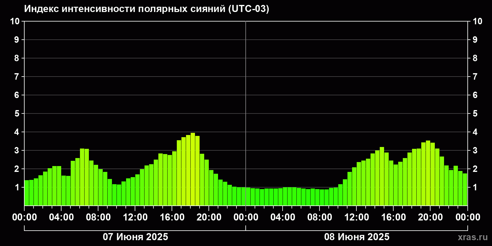 Изменения индекса интенсивности полярных сияний с 2025-06-07 по 2025-06-08 по местному времени