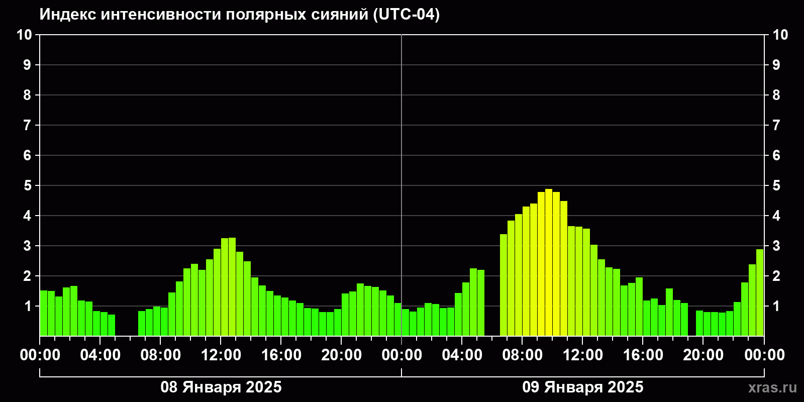Изменения индекса интенсивности полярных сияний с 2025-01-08 по 2025-01-09 по местному времени