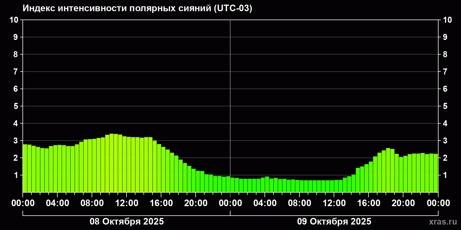 Изменения индекса интенсивности полярных сияний с 2025-10-08 по 2025-10-09 по местному времени