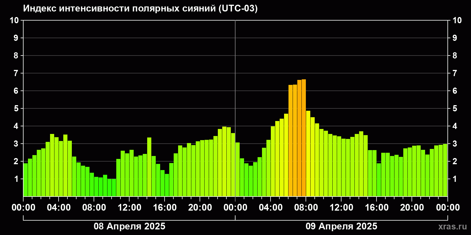 Изменения индекса интенсивности полярных сияний с 2025-04-08 по 2025-04-09 по местному времени