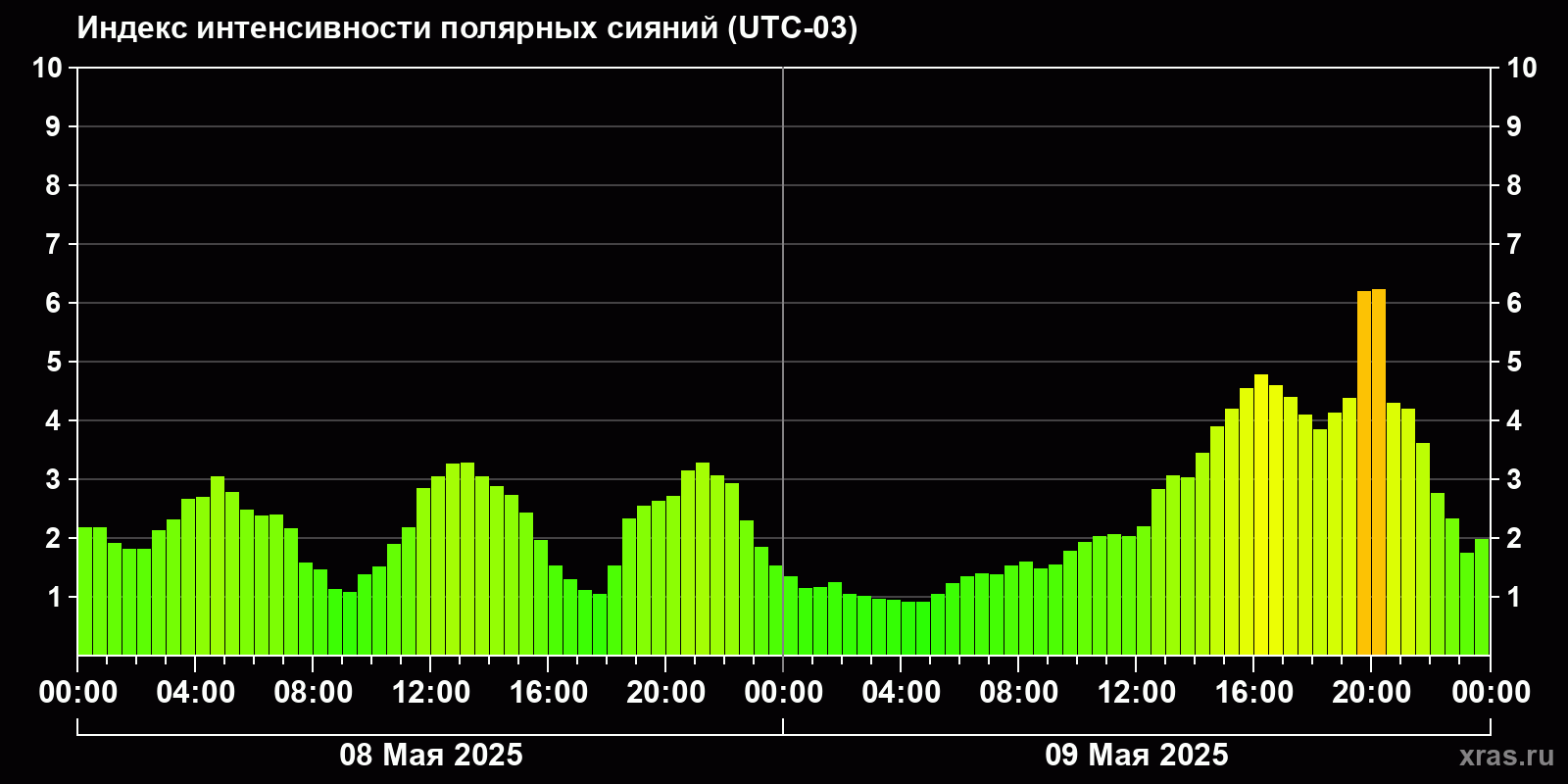 Изменения индекса интенсивности полярных сияний с 2025-05-08 по 2025-05-09 по местному времени