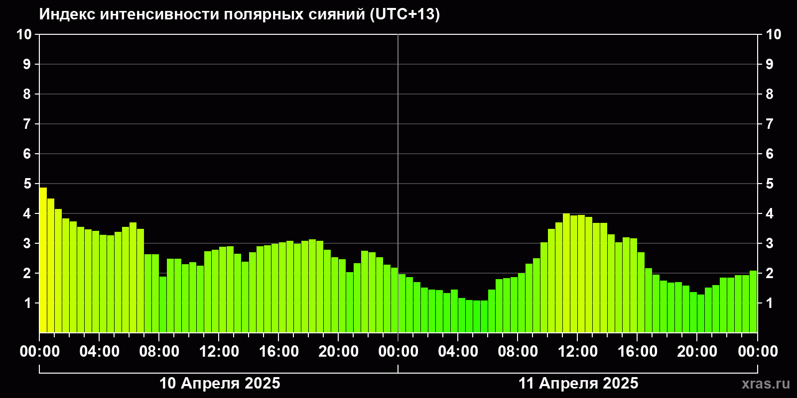 Изменения индекса интенсивности полярных сияний с 2025-04-10 по 2025-04-11 по местному времени