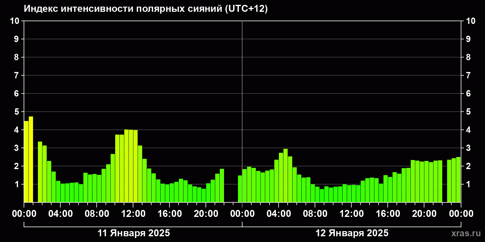 Изменения индекса интенсивности полярных сияний с 2025-01-11 по 2025-01-12 по местному времени