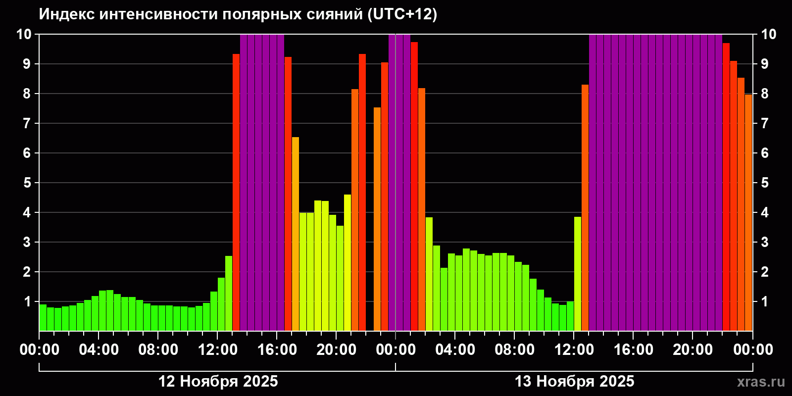 Изменения индекса интенсивности полярных сияний с 2025-11-12 по 2025-11-13 по местному времени