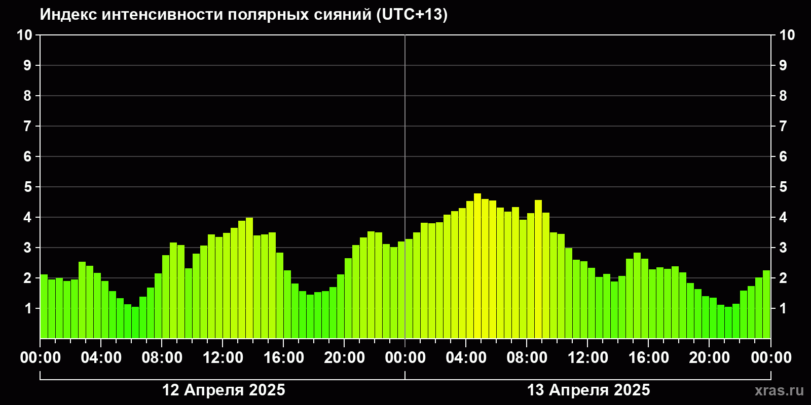 Изменения индекса интенсивности полярных сияний с 2025-04-12 по 2025-04-13 по местному времени