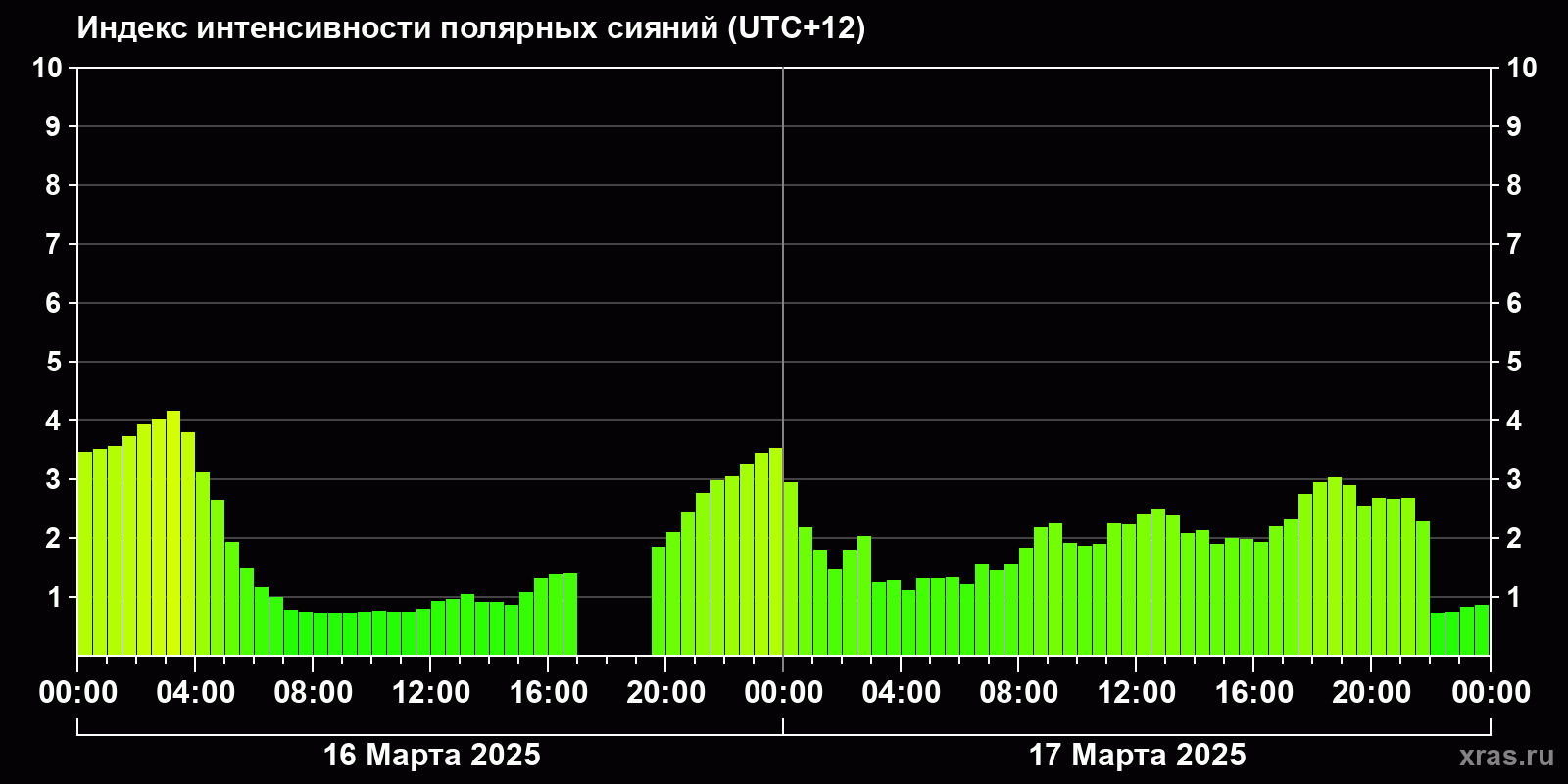 Изменения индекса интенсивности полярных сияний с 2025-03-16 по 2025-03-17 по местному времени