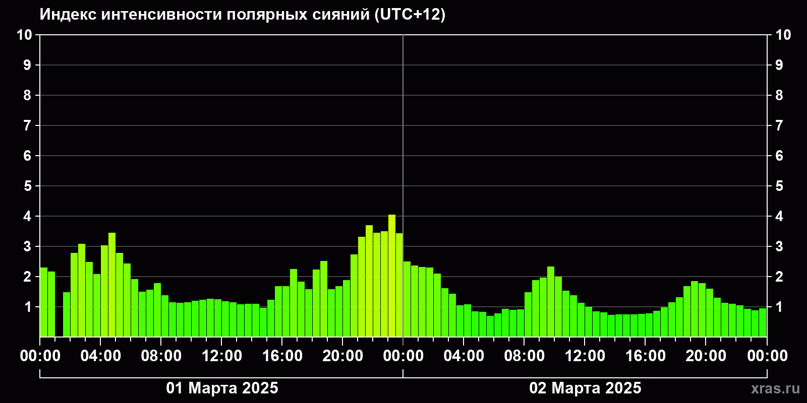 Изменения индекса интенсивности полярных сияний с 2025-03-01 по 2025-03-02 по местному времени