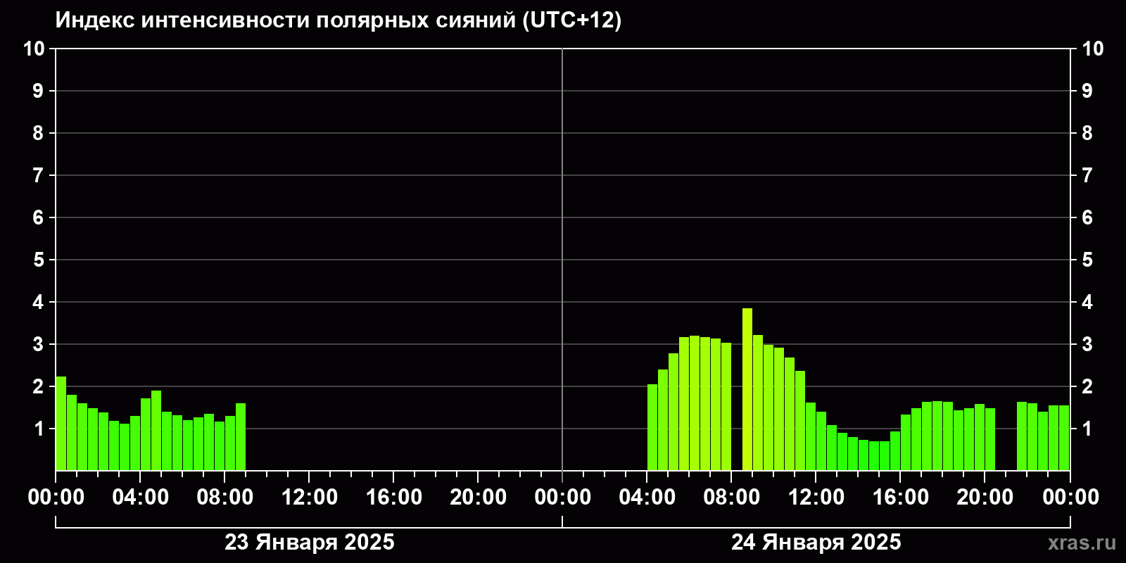 Изменения индекса интенсивности полярных сияний с 2025-01-23 по 2025-01-24 по местному времени