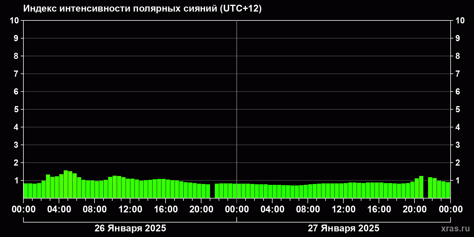 Изменения индекса интенсивности полярных сияний с 2025-01-26 по 2025-01-27 по местному времени