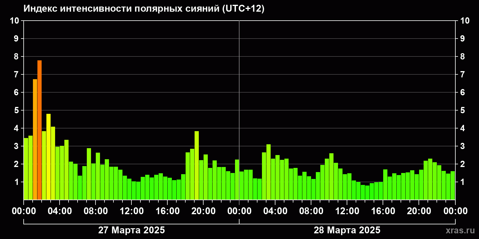 Изменения индекса интенсивности полярных сияний с 2025-03-27 по 2025-03-28 по местному времени