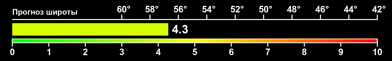 Индекс интенсивности полярных сияний и теоретически возможная широта наблюдений для ночного времени в западном полушарии по состоянию на 2025-04-05 22:51 (конец дня) по местному времени