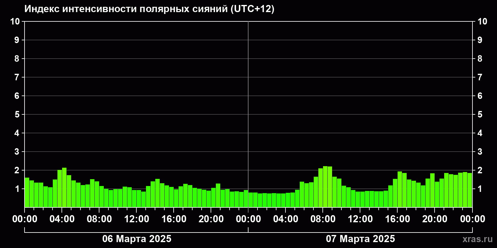 Изменения индекса интенсивности полярных сияний с 2025-03-06 по 2025-03-07 по местному времени