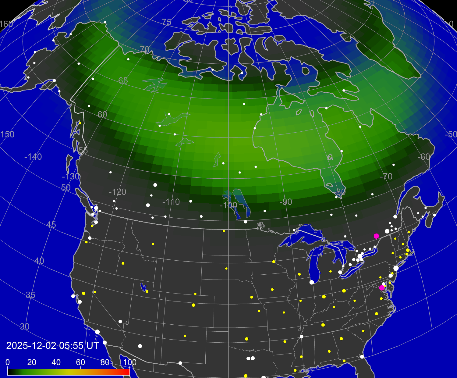 Изменения и часовой прогноз индекса интенсивности полярных сияний с 2025-11-30 по 2025-12-01