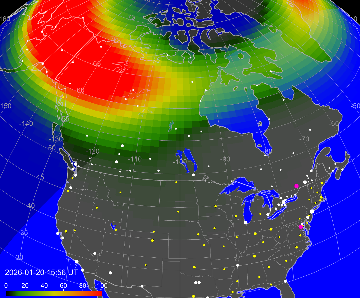 Изменения и часовой прогноз индекса интенсивности полярных сияний с 2026-01-20 по 2026-01-21