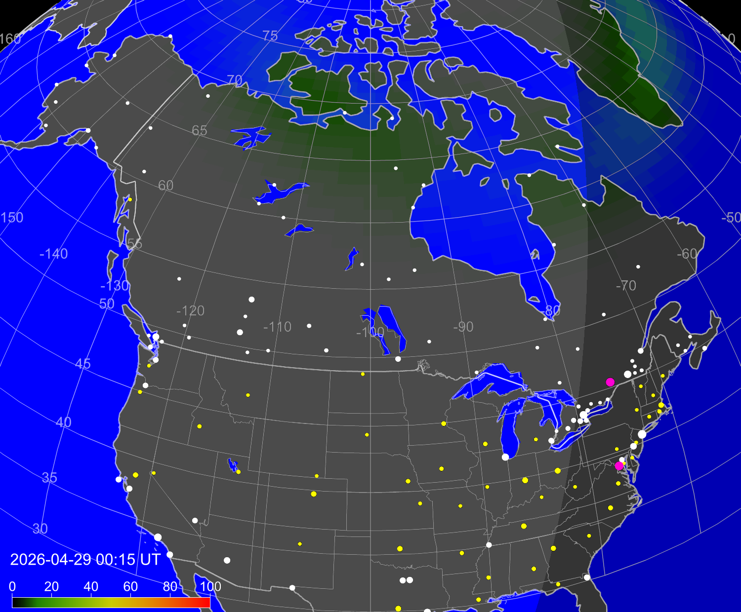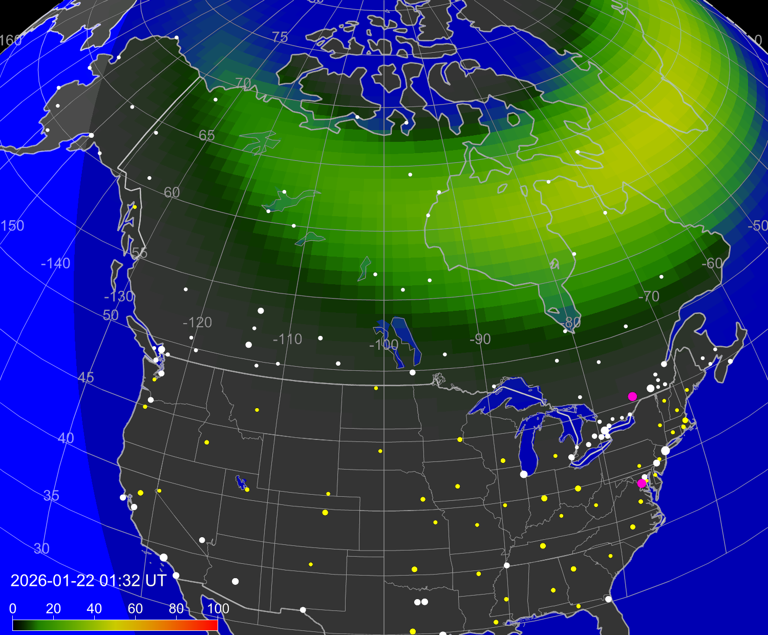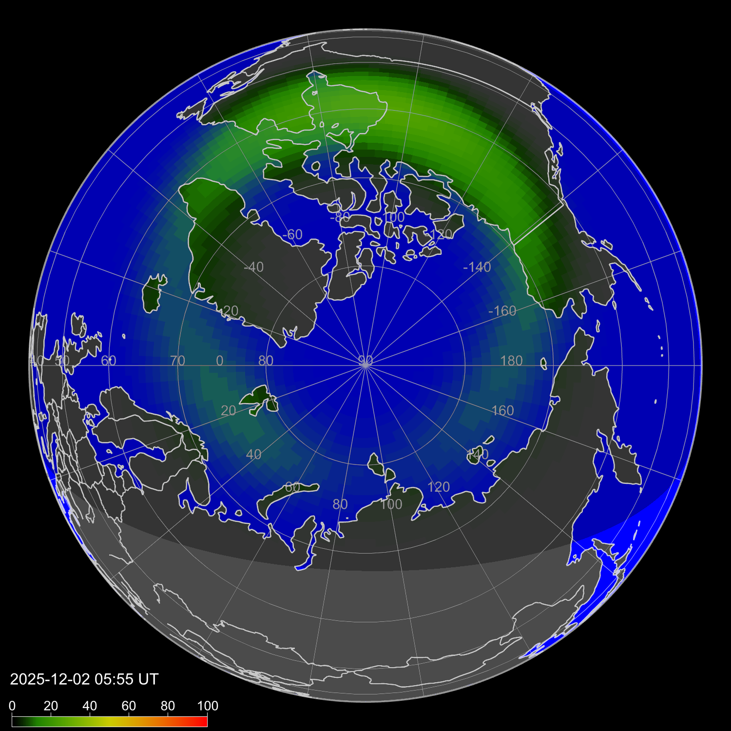 Индекс интенсивности полярных сияний и теоретически возможная широта наблюдений для ночного времени в западном полушарии