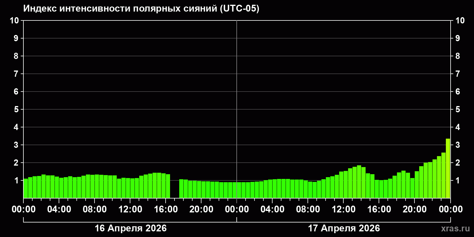 Изменения индекса интенсивности полярных сияний с 2026-04-16 по 2026-04-17 по местному времени