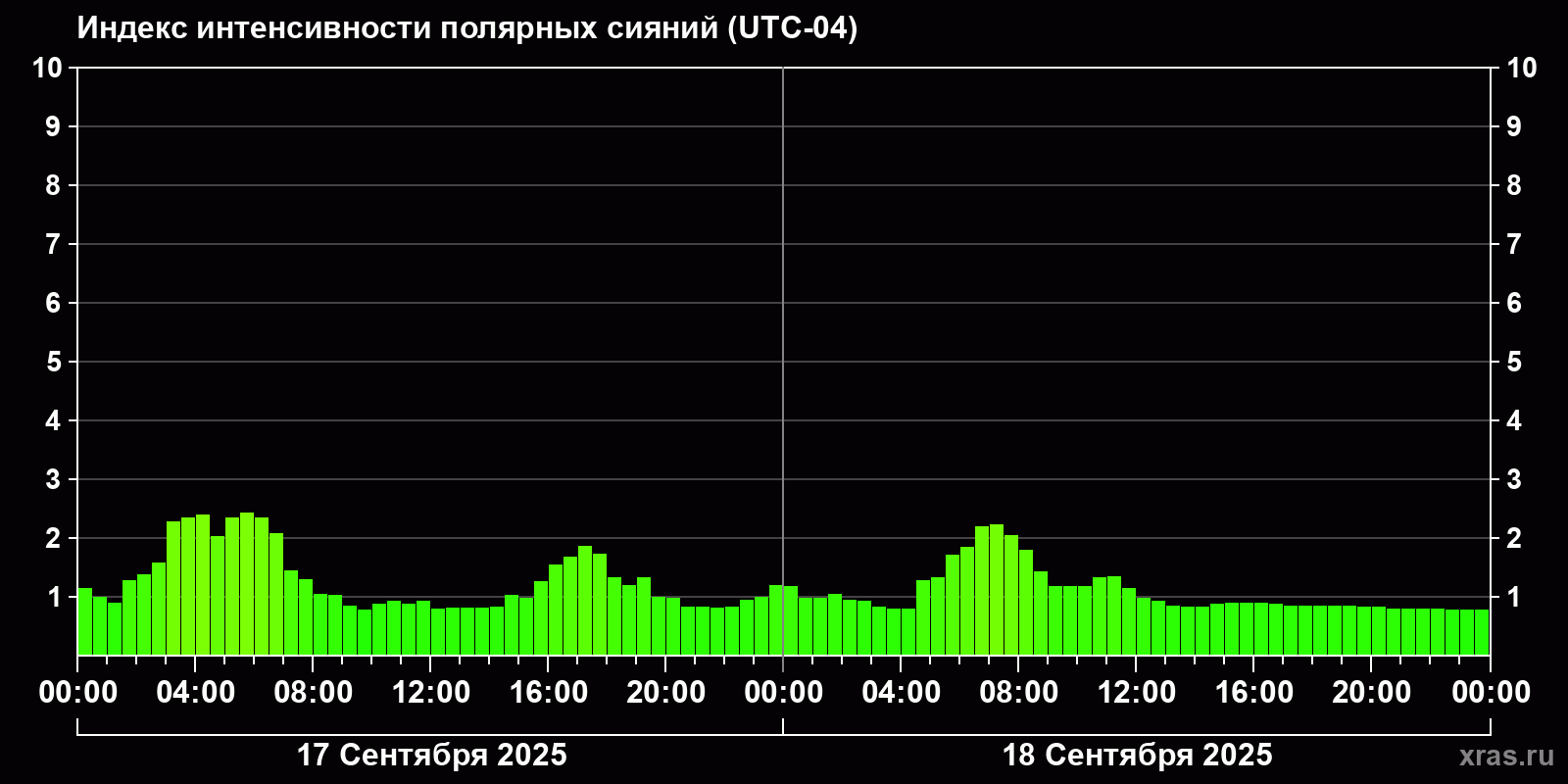 Изменения индекса интенсивности полярных сияний с 2025-09-17 по 2025-09-18 по местному времени