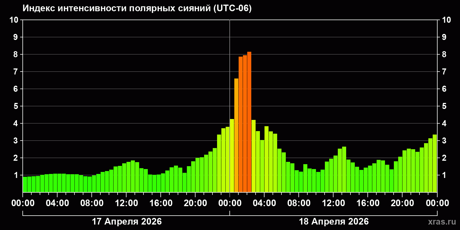 Изменения индекса интенсивности полярных сияний с 2026-04-17 по 2026-04-18 по местному времени