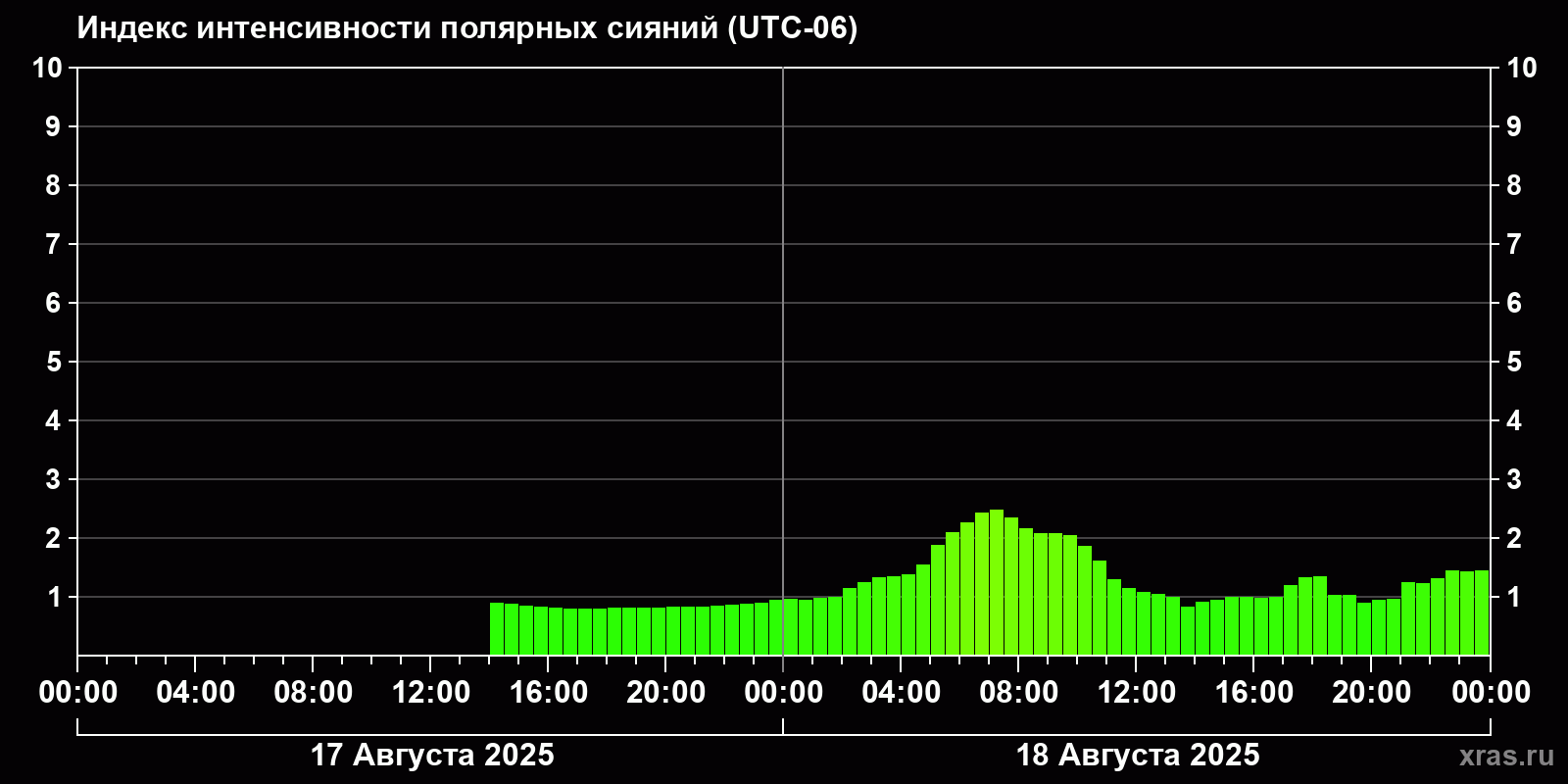 Изменения индекса интенсивности полярных сияний с 2025-08-17 по 2025-08-18 по местному времени
