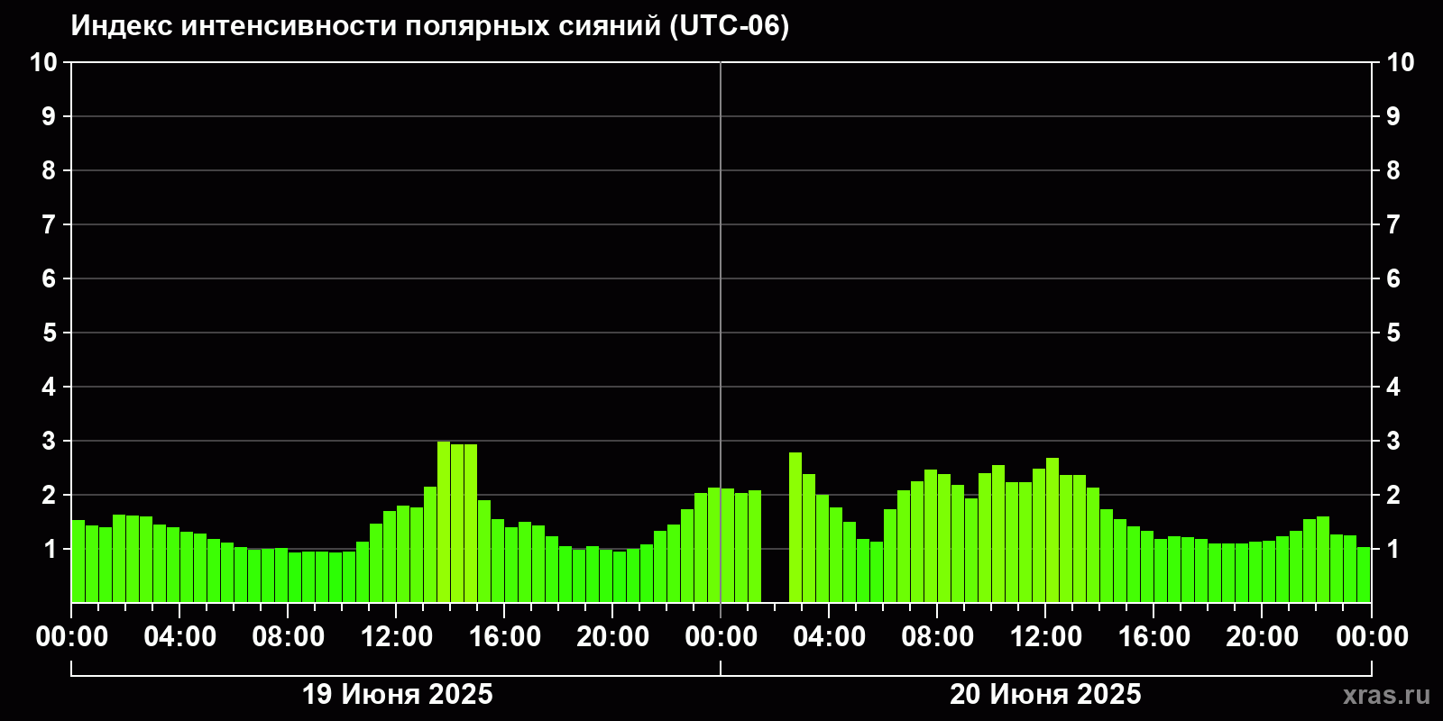 Изменения индекса интенсивности полярных сияний с 2025-06-19 по 2025-06-20 по местному времени