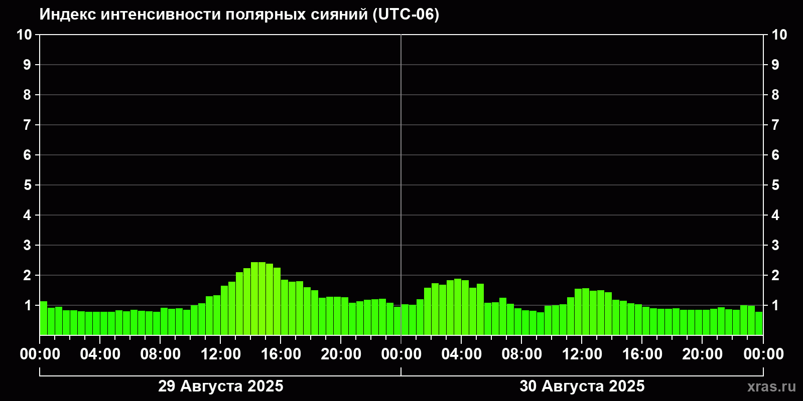 Изменения индекса интенсивности полярных сияний с 2025-08-29 по 2025-08-30 по местному времени