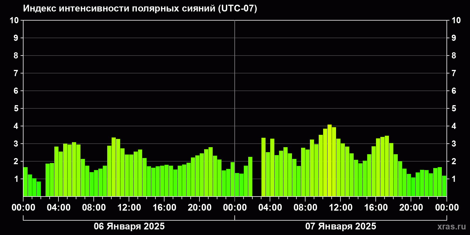 Изменения индекса интенсивности полярных сияний с 2025-01-06 по 2025-01-07 по местному времени