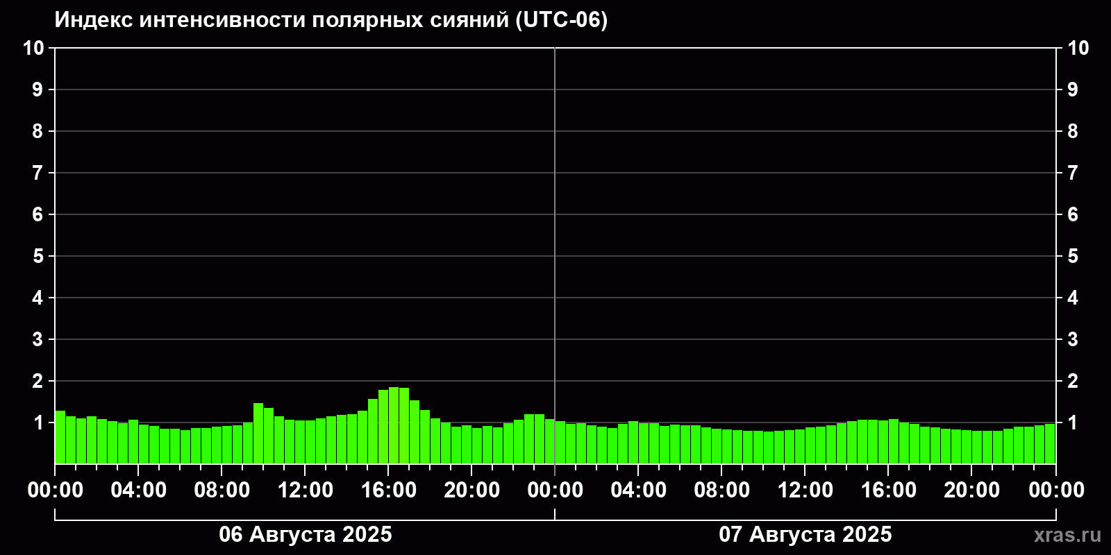 Изменения индекса интенсивности полярных сияний с 2025-08-06 по 2025-08-07 по местному времени
