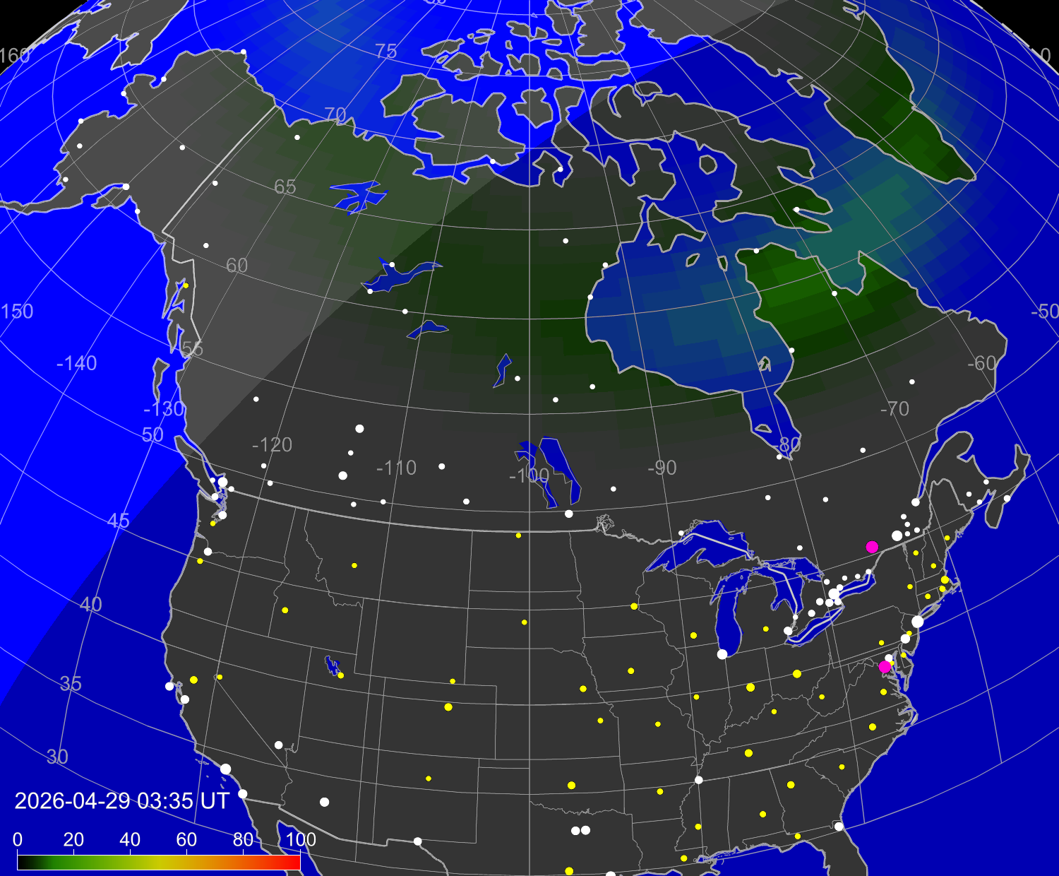 Индекс интенсивности полярных сияний и теоретически возможная широта наблюдений для ночного времени в западном полушарии