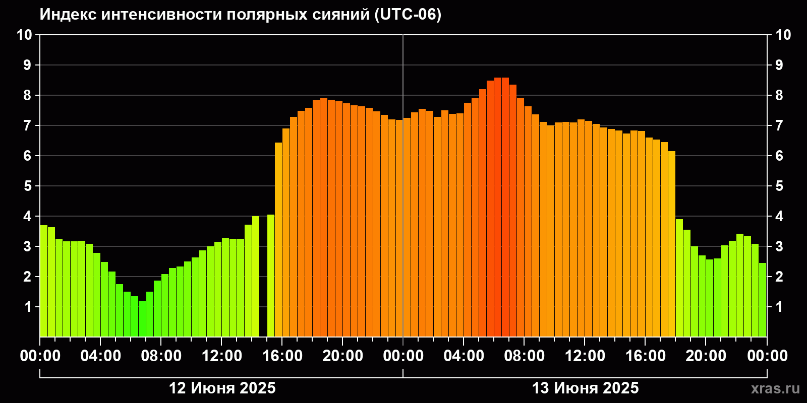 Изменения индекса интенсивности полярных сияний с 2025-06-12 по 2025-06-13 по местному времени