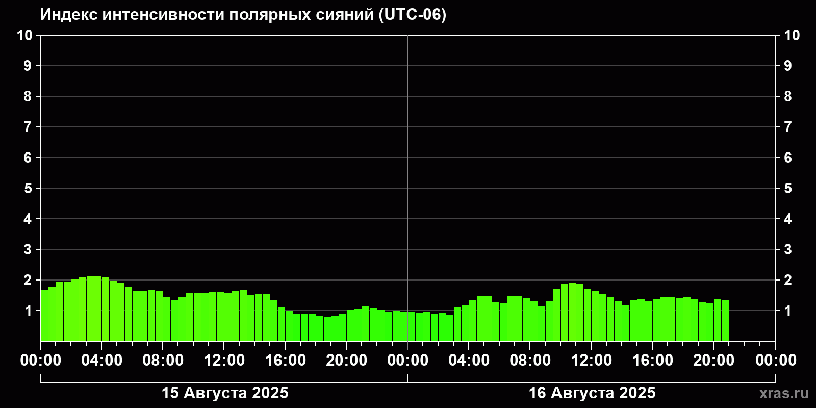 Изменения индекса интенсивности полярных сияний с 2025-08-15 по 2025-08-16 по местному времени