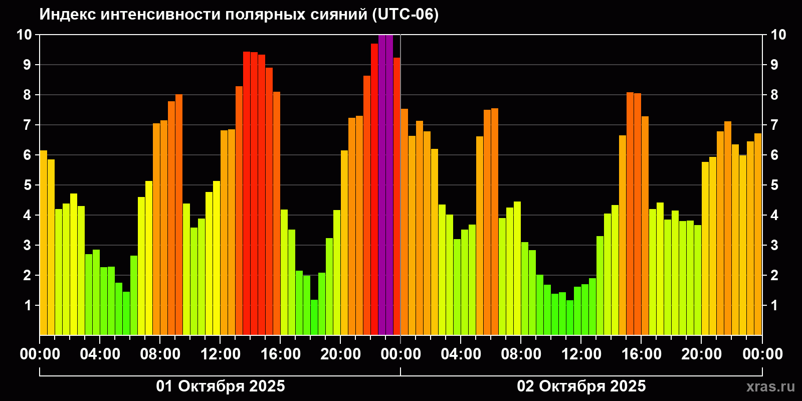 Изменения индекса интенсивности полярных сияний с 2025-10-01 по 2025-10-02 по местному времени