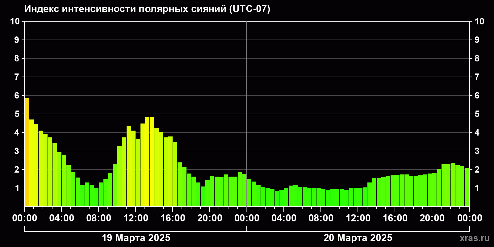 Изменения индекса интенсивности полярных сияний с 2025-03-19 по 2025-03-20 по местному времени