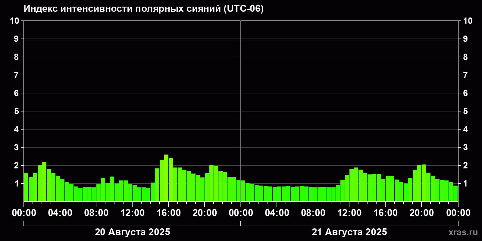 Изменения индекса интенсивности полярных сияний с 2025-08-20 по 2025-08-21 по местному времени