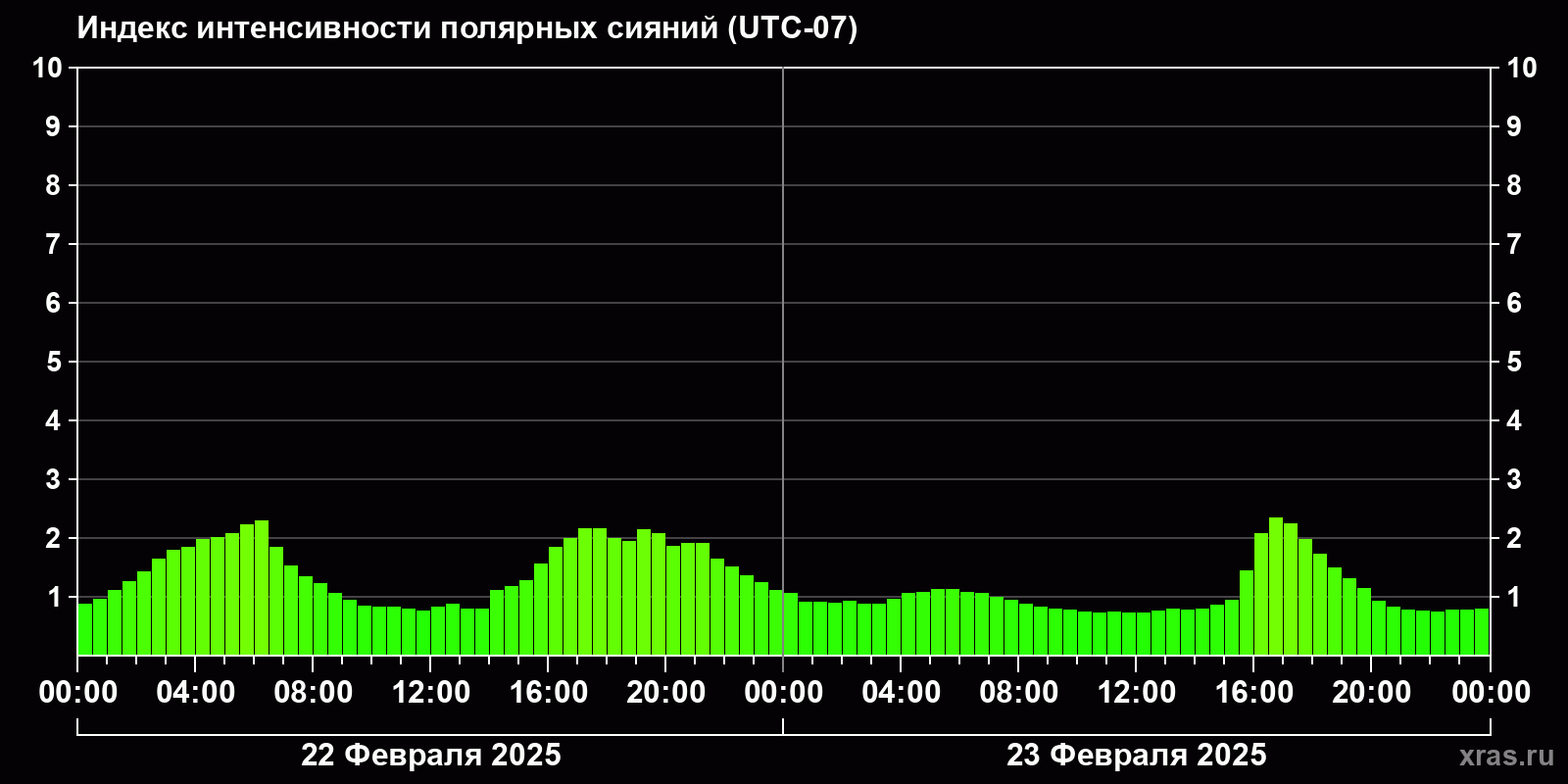 Изменения индекса интенсивности полярных сияний с 2025-02-22 по 2025-02-23 по местному времени