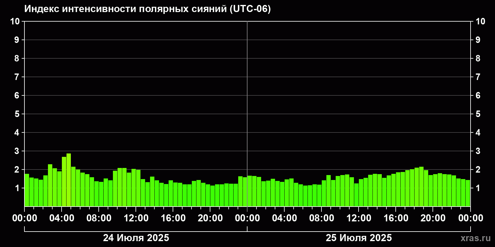 Изменения индекса интенсивности полярных сияний с 2025-07-24 по 2025-07-25 по местному времени