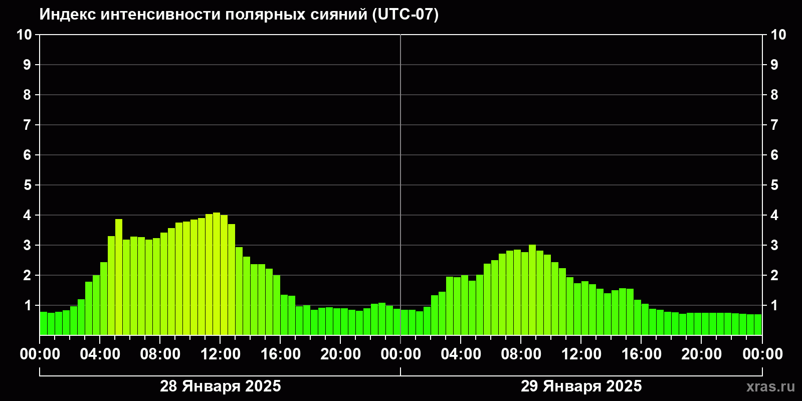 Изменения индекса интенсивности полярных сияний с 2025-01-28 по 2025-01-29 по местному времени