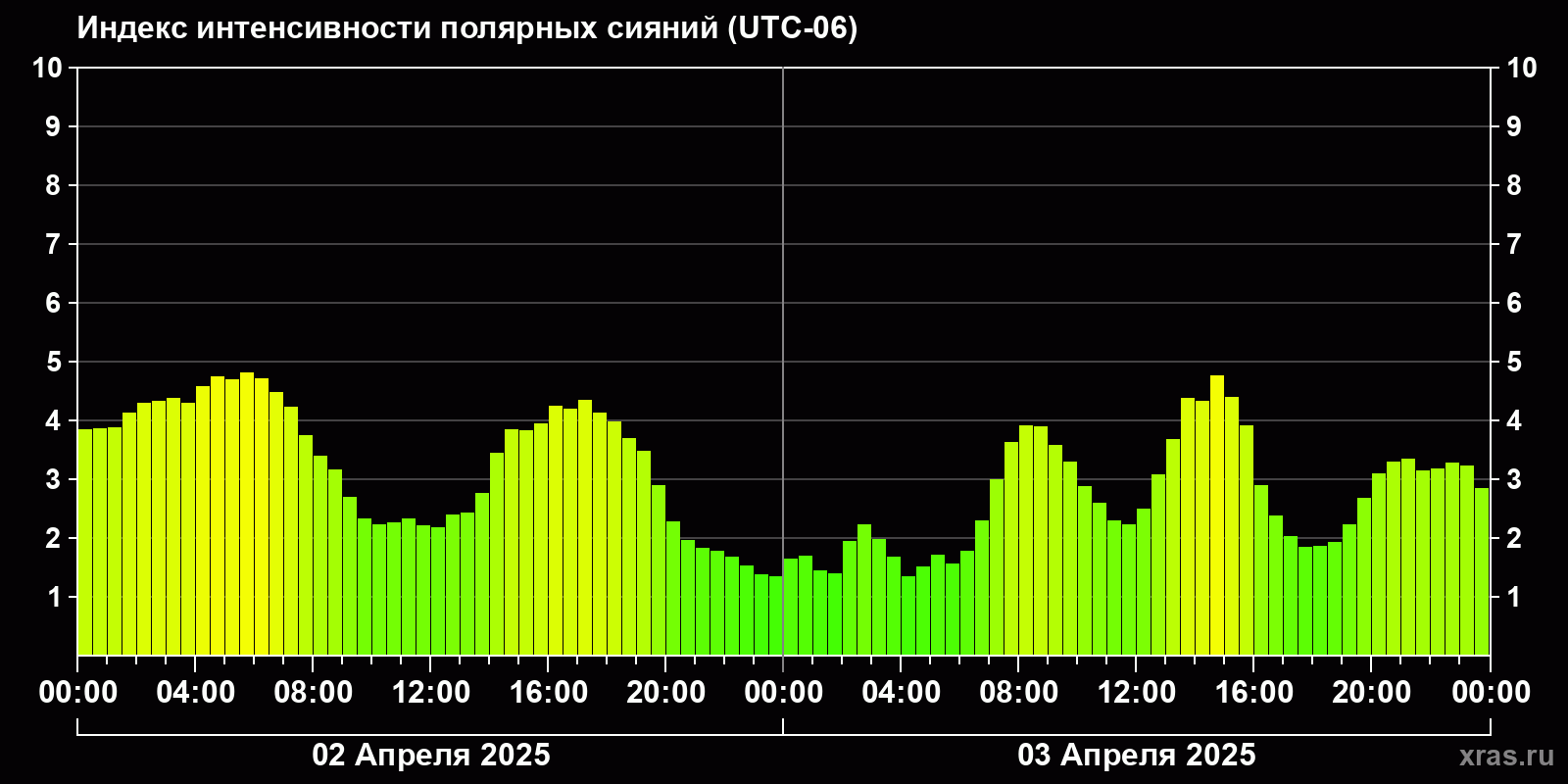 Изменения индекса интенсивности полярных сияний с 2025-04-02 по 2025-04-03 по местному времени