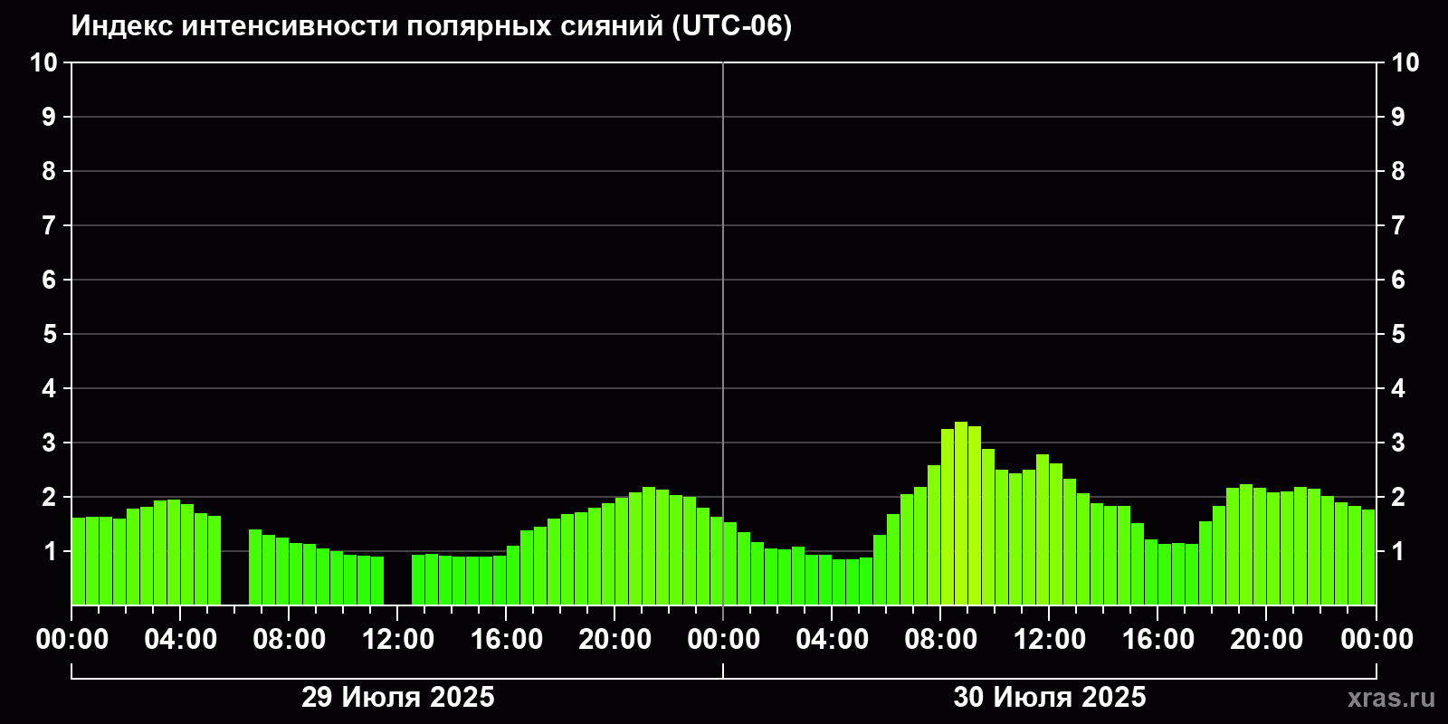 Изменения индекса интенсивности полярных сияний с 2025-07-29 по 2025-07-30 по местному времени
