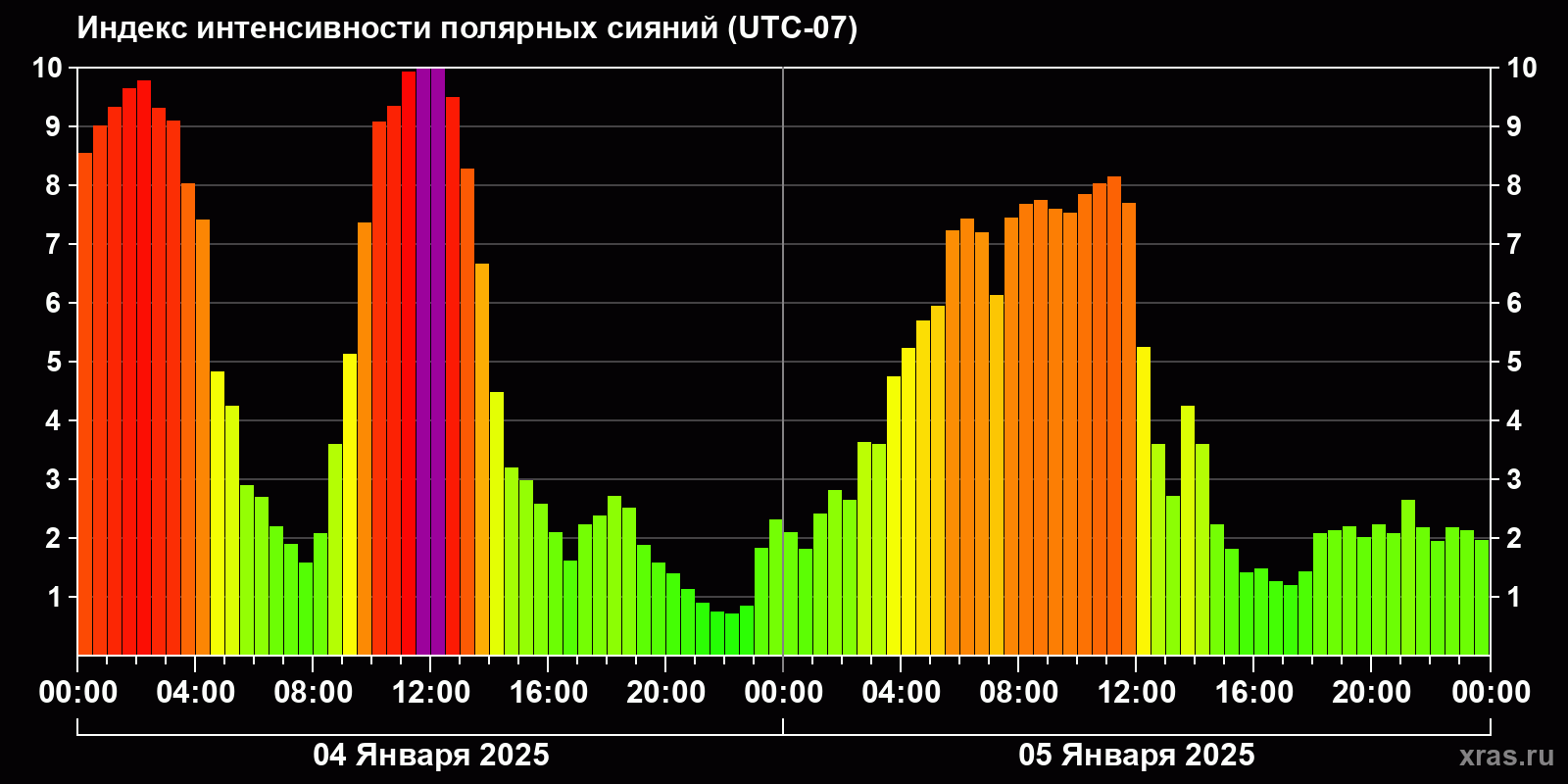 Изменения индекса интенсивности полярных сияний с 2025-01-04 по 2025-01-05 по местному времени
